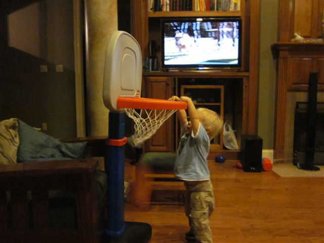 i think the terrible twos have arrived ahead of schedule. john was one mini-tantrum after another, all weekend long. he doesn't cling to them, but there have been some doozies. the "best" was probably saturday night, after nana got him the basketball net. he played basketball for about an hour, and then i told him it was time to say night night to the basketball. and he fell out.